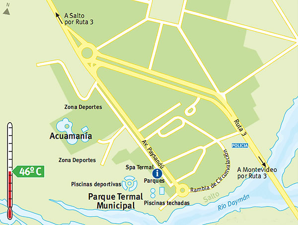 Las Termas del Daymán son las más grandes del país, con muy diversas instalaciones en su inmenso parque. En este mapa de las Termas del Daymán se muestran las vías de acceso al complejo tanto desde Salto como desde Montevideo, además de las diferentes áreas que componen el parque.